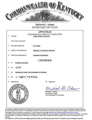 Hague Apostille Convention, an apostille stamp affixed by the Secretary of State of Kentucky will generally be recognized directly as confirming authenticity, although a certified translation may also be required if presenting to a country that does not have English as an official language.