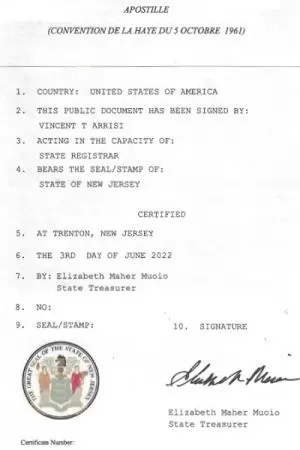 A New Jersey Apostille is a certificate that is affixed by the New Jersey Secretary of State to a public document. It certifies the authenticity of the signature appearing on the document as that of an authorized New Jersey public official and confirms the capacity of that official (e.g. State Registrar, notary public).