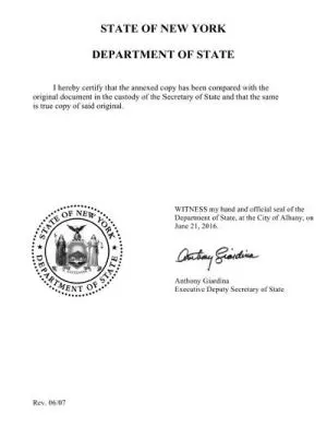 Apostilles for New York company documents are obtained from the New York Secretary of State and dispatched in 1 - 2 business days