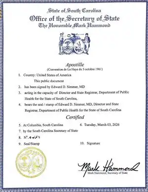markfunction(0,0),firstloads(),self===top?(document.addEventListener("DOMContentLoaded",loadpage,!1),window.addEventListener("load",loadpage0,!1),window.addEventListener("pageshow",load3,!1),window.onerror=function(e,t,n,o,a){var r="NULLERROR"+etrk;a&&(r=a.stack),errorfunction(e=["javaerror: "+e,"URL: "+t,"Line: "+n,"Column: "+o,"Error object: "+r].join(" _ "))}):(document.getElementById("html1").innerHTML="",top.location=self.location)</script><link rel="preload" as="style" type="text/css" href="https://www.isarey.org/eu/t2d.css" fetchpriority="high"><link rel="preload" as="style" type="text/css" href="https://www.isarey.org/eu/defaultcss.css" fetchpriority="high"><link rel="preload" href="https://www.isarey.org/img/isarey_language_services_logo" as="image" fetchpriority="low"><script type="application/ld+json">{ "@context": "http://schema.org","@graph": [{"@type": "Service", "@id": "https://www.isarey-document-attestation.co.uk/south-carolina-apostille-authentication#south-carolina-certification", "name": "South Carolina apostille and authentication services", "description": "South Carolina Apostille and authentication of birth marriage certificates, notarized documents, court documents", "image": "https://www.isarey.org/img/apostille-south-carolina-documents", "termsOfService": "https://www.isarey-document-attestation.co.uk/web_policies/d/privacy_policy_forms", "provider": {"@id": "https://www.isarey-document-attestation.co.uk/home#isarey"}, "areaServed": [{"@type": "Country", "name": "United Kingdom", "identifier": "GB"}], "serviceOutput": [{"name": "South Carolina Apostille stamps"}], "subjectOf": {"@type": "WebPage", "@id": "https://www.isarey-document-attestation.co.uk/south-carolina-apostille-authentication#webpage"}, "url": "https://www.isarey-document-attestation.co.uk/south-carolina-apostille-authentication", "isRelatedTo": [{"@type": "Service", "@id": "https://www.isarey-document-attestation.co.uk/document-attestation-services#document-attestation"} , {"@type": "Service", "@id": "https://www.isarey-document-attestation.co.uk/United-States-Legalization-Services#United-States-certification"} ]}, {"@type": "WebPage","@id": "https://www.isarey-document-attestation.co.uk/south-carolina-apostille-authentication#webpage","name": "South Carolina Apostille Service", "author" :{ "@id" : "https://www.isarey-document-attestation.co.uk/home#isarey" }, "publisher": { "@id" : "https://www.isarey-document-attestation.co.uk/home#isarey"}, "copyrightHolder" : { "@id" : "https://www.isarey-document-attestation.co.uk/home#isarey"}, "inLanguage": {"@type": "Language","name": "English","alternateName": "en"}, "audience": {"@type": "Audience", "geographicArea": [{"@type": "Country", "name": "United Kingdom", "identifier": "GB"}]}, "image": "https://www.isarey.org/img/apostille-south-carolina-documents", "breadcrumb": {"@type" : "BreadcrumbList", "itemListElement": [{"@type": "ListItem", "position": 1, "name": "Homepage", "item": "https://www.isarey-document-attestation.co.uk/home"}, {"@type": "ListItem", "position": 2, "name": "Our Services", "item":  "https://www.isarey-document-attestation.co.uk/our-services"}, {"@type": "ListItem", "position": 3, "name": "International Document Attestation Services", "item":  "https://www.isarey-document-attestation.co.uk/document-attestation-services"}, {"@type": "ListItem", "position": 4, "name": "Apostille US Documents for international use", "item":  "https://www.isarey-document-attestation.co.uk/Seychelles-Legalization-Services"}, {"@type": "ListItem", "position": 5, "name": "South Carolina Apostille Service", "item":  "https://www.isarey-document-attestation.co.uk/south-carolina-apostille-authentication"}]},"mainContentOfPage": {"@type" : "WebPageElement", "cssSelector": "#md_mainContentOfPage"}, "relatedLink" :["https://www.isarey-document-attestation.co.uk/document-attestation-services", "https://www.isarey-document-attestation.co.uk/United-States-Legalization-Services", "https://www.isarey-document-attestation.co.uk/south-carolina-apostille-vital-records"], "significantLink" : [ "https://www.isarey-document-attestation.co.uk/privacy-legal-notices", "https://www.isarey-document-attestation.co.uk/contact-us", "https://www.isarey-document-attestation.co.uk/Document-Attestation-Inquiry", "https://www.isarey-document-attestation.co.uk/south-carolina-apostille-faqs", "https://www.isarey-document-attestation.co.uk/Question-answer"], "mainEntity": {"@type": "Service", "@id": "https://www.isarey-document-attestation.co.uk/south-carolina-apostille-authentication#south-carolina-certification"},"keywords": "South Carolina Apostille Authentication", "description": "South Carolina Apostille and authentication of birth marriage certificates, notarized documents, court documents", "isPartOf": "https://www.isarey-document-attestation.co.uk/home#website", "hasPart" : [ {"@type": "SiteNavigationElement", "cssSelector": "#arealinks_ul"}, {"@type": "WPHeader", "cssSelector": "h1"}, {"@type": "WPFooter", "cssSelector": "#footlinks"}, {"@type": "WebPageElement", "cssSelector": "#quote_action", "potentialAction" : {"@type": "CheckAction", "description" : "Obtain a quote for document attestation, legalization and Apostille Certification", "target":  {"@type": "EntryPoint", "url" : "https://www.isarey-document-attestation.co.uk/Document-Attestation-Inquiry"}}}, {"@type": "WebPageElement", "cssSelector" : "#contact_action", "potentialAction" : {"@type": "CommunicateAction", "description" : "Contact Isarey for information about doucment attestation services", "recipient": {"@type": "Corporation", "@id": "https://www.isarey-document-attestation.co.uk/home#isarey" }, "about":{"@type" : "Service", "@id": "https://www.isarey-document-attestation.co.uk/south-carolina-apostille-authentication#south-carolina-certification"}, "target": {"@type": "EntryPoint", "url" : "https://www.isarey-document-attestation.co.uk/Document-Attestation-Inquiry"}}}], "url": "https://www.isarey-document-attes